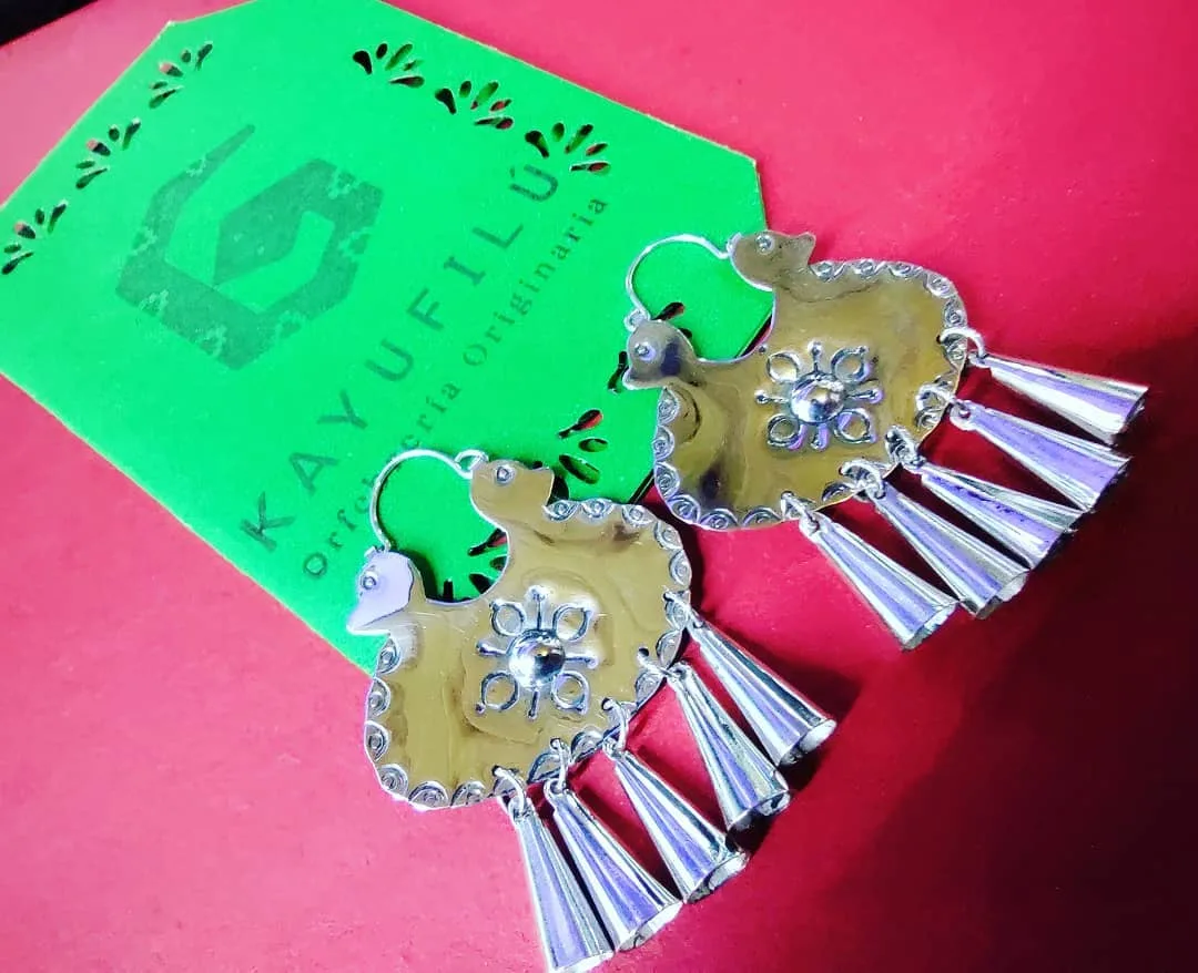 Chaway con diseño Epu Pinda (colibri), son dos pinda por la dualidad de nuestra cultura el cual representa la union del Wentru (hombre) y la Zomo (mujer), con una rayen foyee en el centro (flor del canelo) y los Llol Llol (campanas) las cuales son de protección para espantar los malos espíritus o malas vibras.